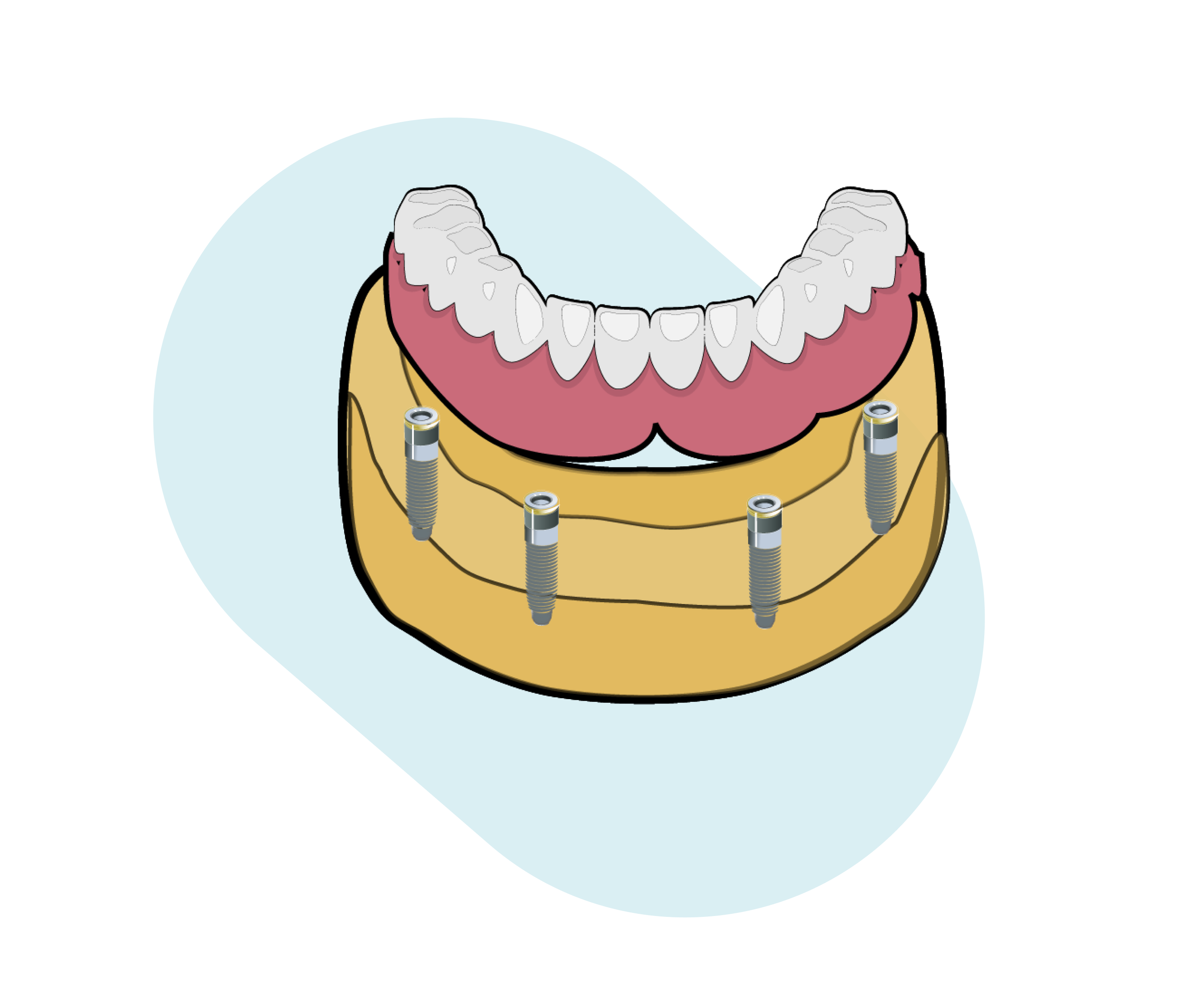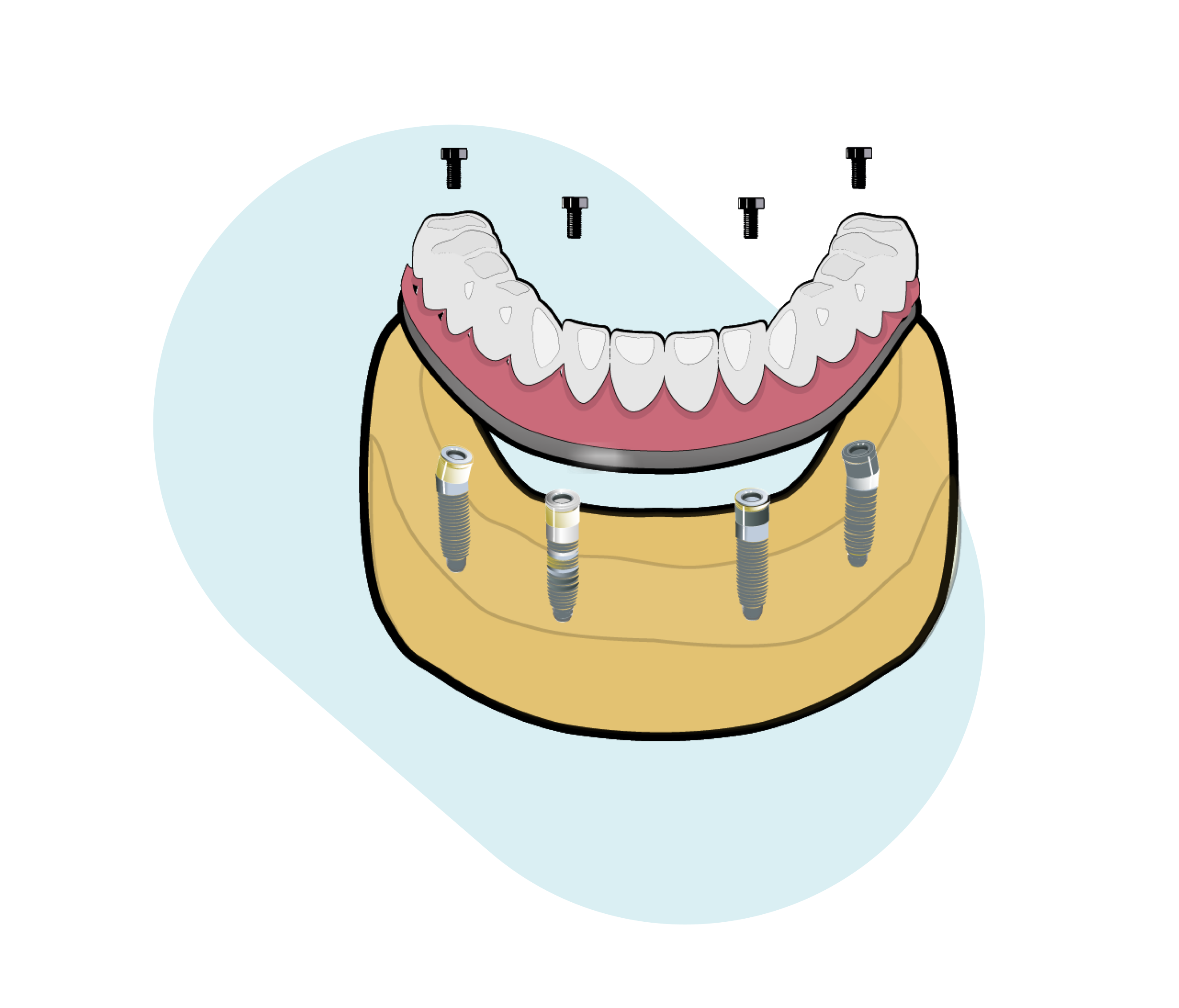 Non-removable dentures, such as the All-on-4 dentures, are fixed to 4-6 dental implants for maximum hold. The ideal option for most patients, though daily irrigation cleaning (with a product like a WATERPIK) is required.